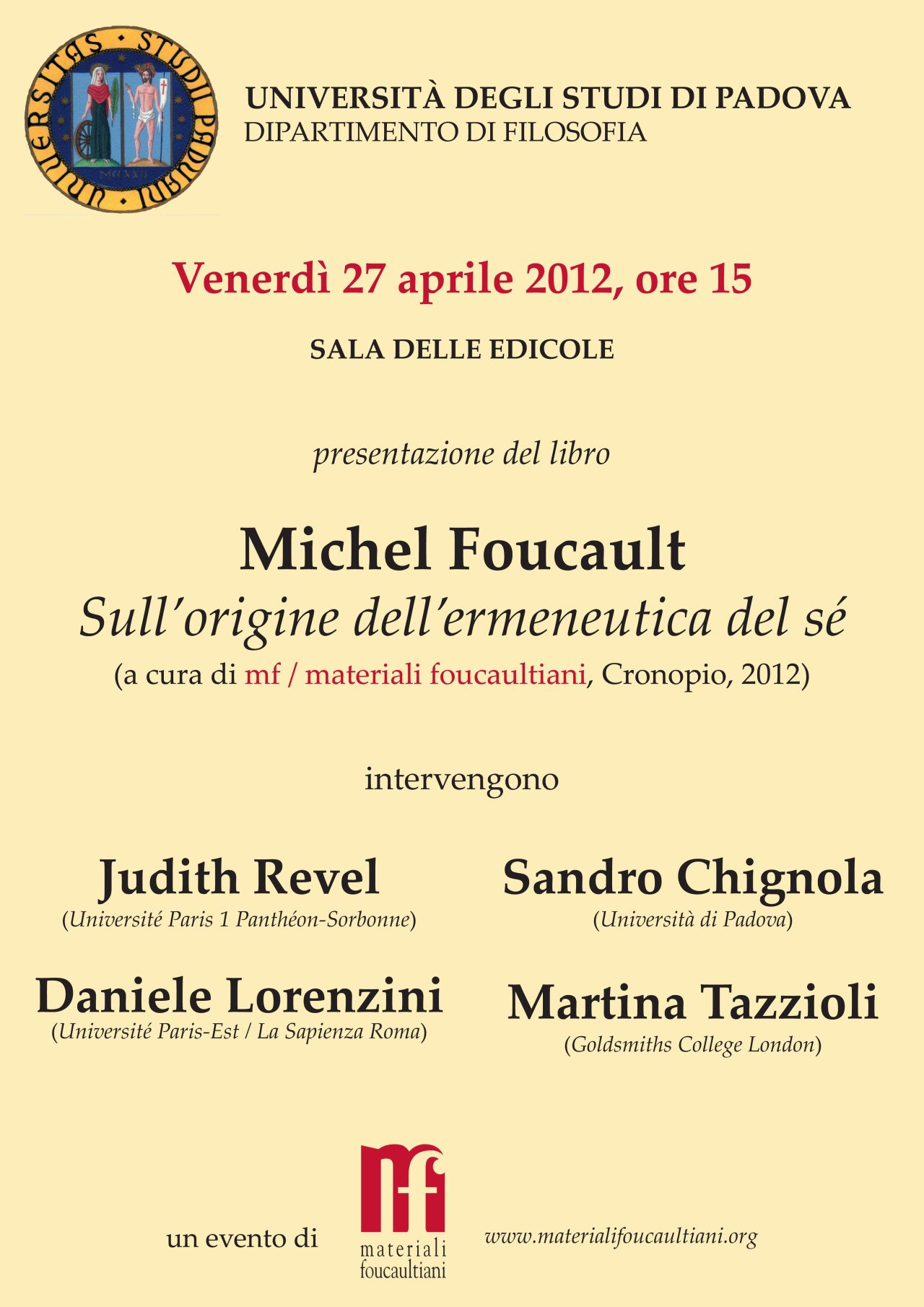 Roundtable on Michel Foucault, “Sull’origine dell’ermeneutica del sé. Due conferenze al Dartmouth College”, edited and translated by mf / materiali foucaultiani (Cronopio, Napoli, 2012)