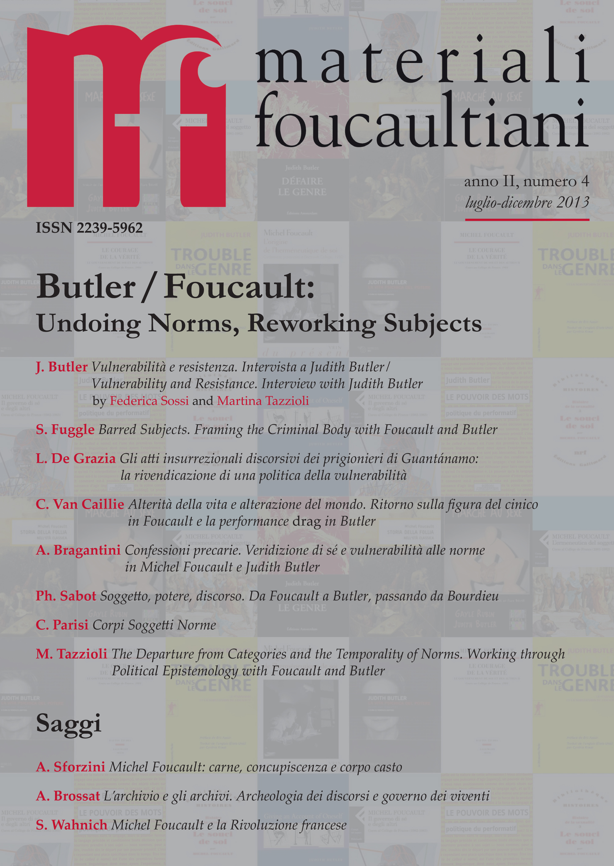 New issue of materiali foucaultiani (II:4), consecrated mostly (but not exclusively) to “Butler/Foucault: Undoing Norms, Reworking Subjects”.