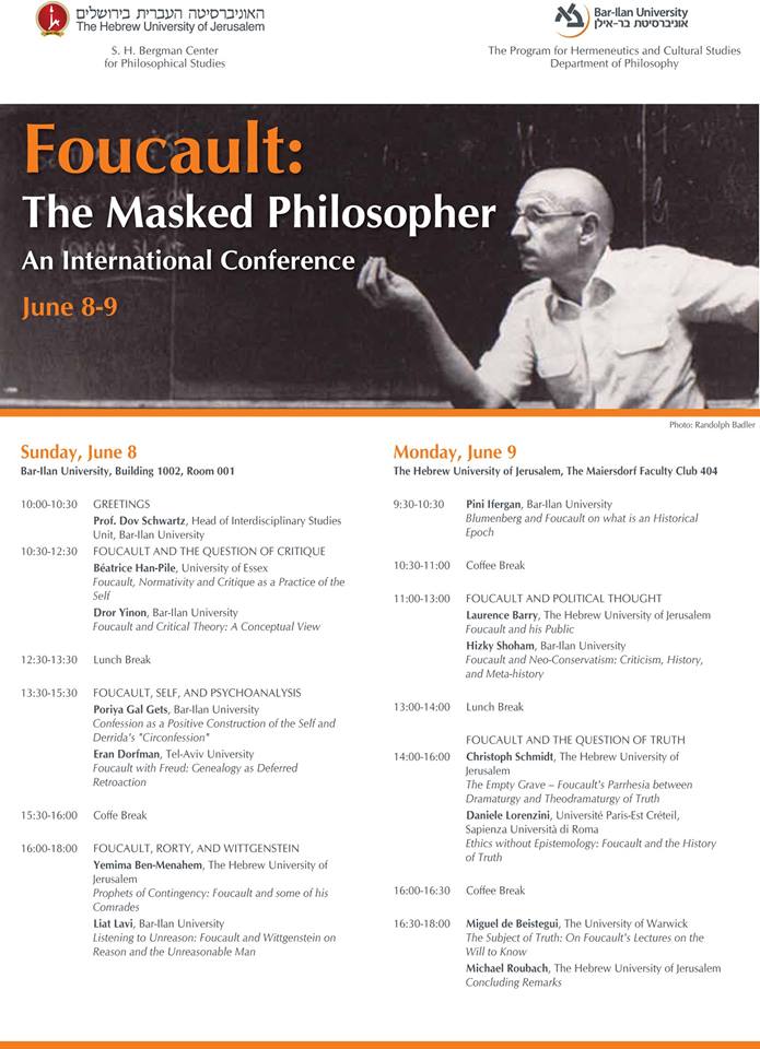 Foucault: The Masked Philosopher. Conference (2014) Clare O'Farrell no comments 3 June 2014 “Foucault: The Masked Philosopher” An International Conference June 8-9, 2014 Bar-Ilan University & The Hebrew University of Jerusalem Share this:Share Click to share on Facebook (Opens in new window) Facebook Click to email a link to a friend (Opens in new window) Email Click to print (Opens in new window) Print Click to share on LinkedIn (Opens in new window) LinkedIn Click to share on Reddit (Opens in new window) Reddit Click to share on Bluesky (Opens in new window) Bluesky Click to share on WhatsApp (Opens in new window) WhatsApp Click to share on Mastodon (Opens in new window) Mastodon Click to share on Pinterest (Opens in new window) Pinterest Click to share on Threads (Opens in new window) Threads Click to share on Tumblr (Opens in new window) Tumblr Click to share on X (Opens in new window) X Click to share on Pocket (Opens in new window) Pocket Like Loading... Related