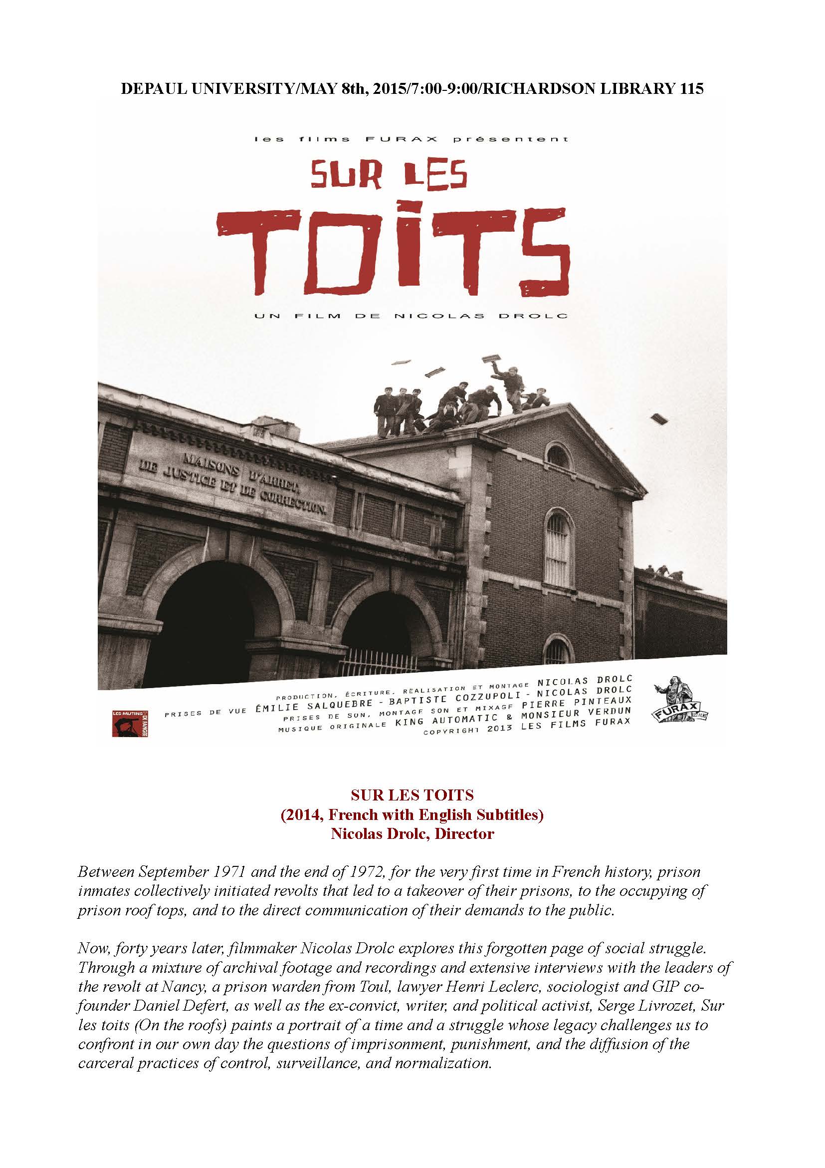 Between September 1971 and the end of 1972, for the very first time in French history, prison inmates collectively initiated revolts that led to a takeover of their prisons, to the occupying of prison roof tops, and to the direct communication of their demands to the public.