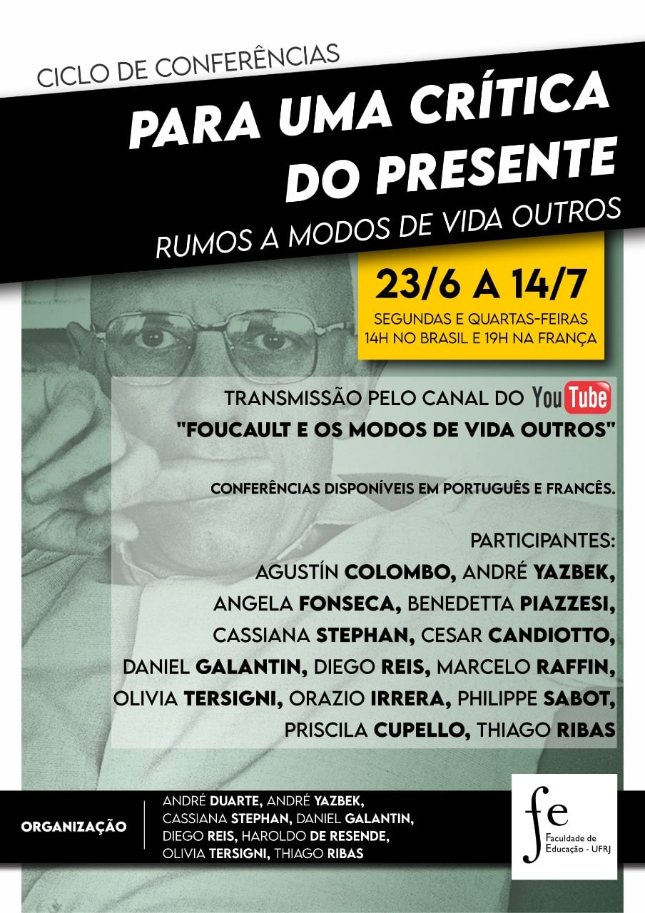 As conferências serão transmitidas ao vivo pelo canal do Youtube “Foucault e os modos de vida outros”: