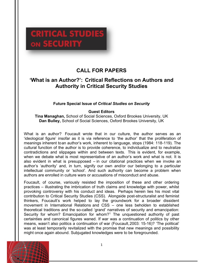 CFP: ‘Whatis anAuthor?’:Critical Reflections on Authors and Authority in Critical Security Studies