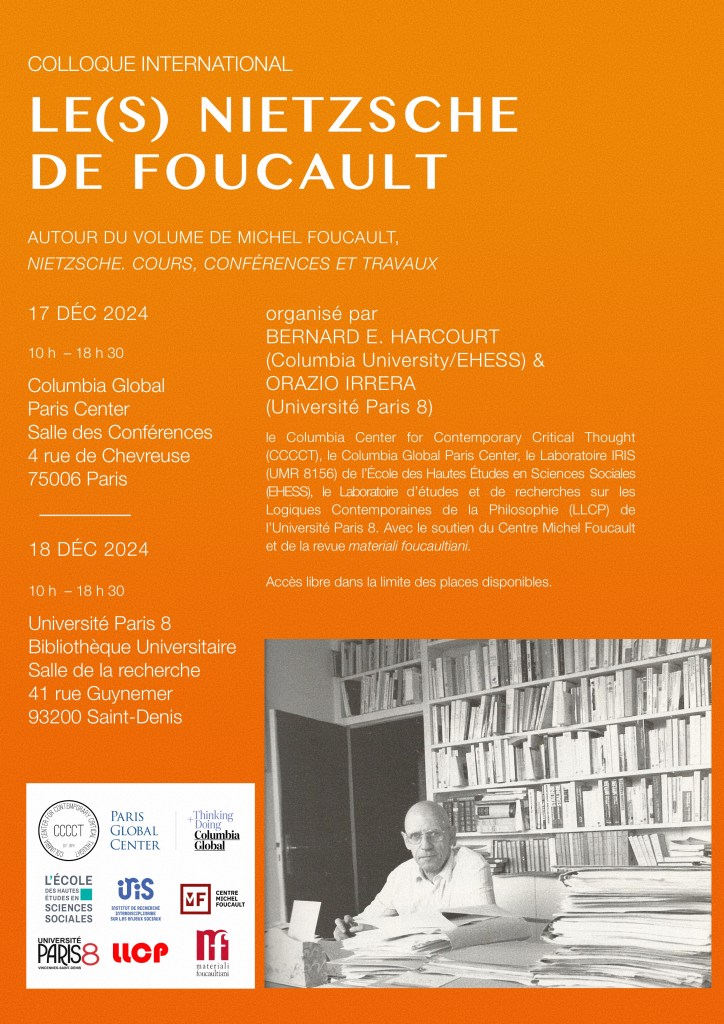 Événement coorganisé par le Columbia Center for Contemporary Critical Thought (CCCCT), le Columbia Global Paris Center, le Laboratoire IRIS (UMR 8156) de l’École des Hautes Études en Sciences Sociales (EHESS), le Laboratoire d’études et de recherches sur les Logiques Contemporaines de la Philosophie (LLCP, EA 4008) de l’Université Paris 8 ; avec le soutien du Centre Michel Foucault et de la revue « materiali foucaultiani ».