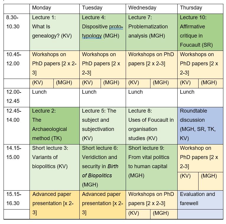 The goal is to sharpen the participants’ knowledge of the Foucauldian toolbox of analytical resources and how these can be applied in PhD projects. To that end we will set aside sufficient time to carefully examine and discuss the papers submitted by the participants. The course will consist of both workshops and lectures/presentations by scholars who are specialist in Foucault’s work and subsequent Foucauldian scholarship. The goal of the lectures is, first, to clarify the ways in which Foucault worked with his most significant analytics and, second, to demonstrate how to put the analytics at work in specific analysis. The aim of the workshops is to explore how Foucauldian analytics function (or possible may be employed) in each participant’s research – with the aim of strengthening, deepening and nuancing the participants’ dissertations or research articles. In the workshops, the course participants are divided into smaller groups (using shared topics and/or approaches as choice criteria) enabling a substantial peer discussion of both paper and their research project. Each workshop will be supervised and organized by one of lecturers.